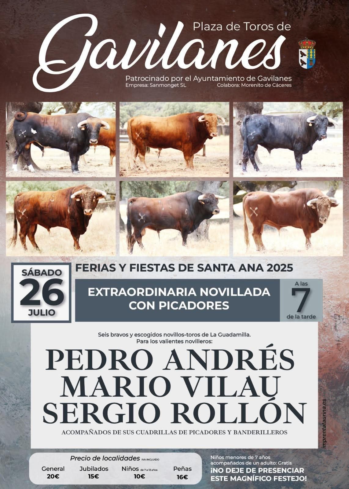MARIO VILAU Ahí están los seis novillitos, seis... que está tarde lidiarán los toreros PEDRO ANDRÉS, MARIO VILAU y SERGIO ROLLON, en las Fiestas de Santa Ana de la localidad de Gavilanes, en el precioso Valle del Tiétar a los pies de la Sierra de Gredos, en la provincia de Ávila. ¡MUCHA SUERTE!