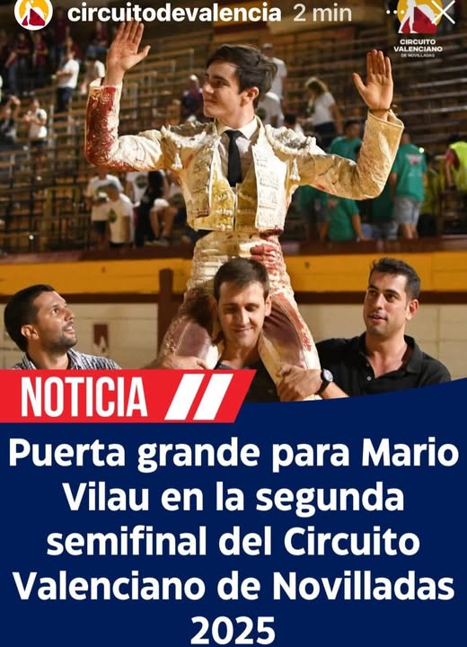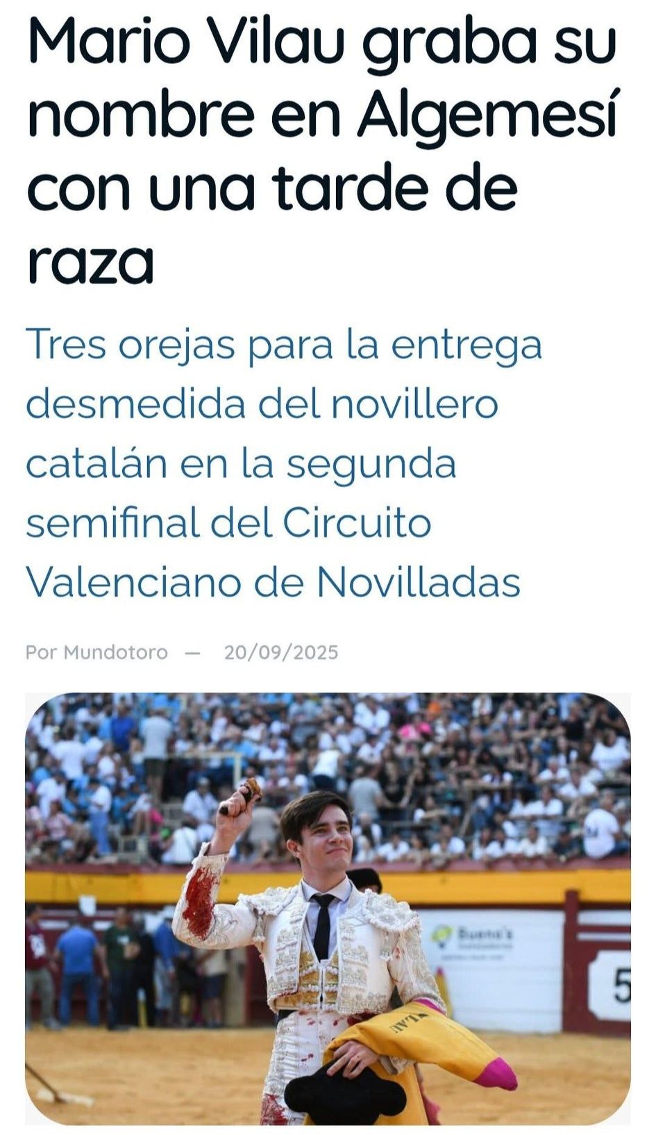 14-09-2025 MARIO VILAU no cesa de llamar a la puerta de las ferias y de presentar su candidatura a ser la próxima temporada uno de los novilleros punteros. Tras los primeros éxitos, el novillero catalán pegó en Ceret un golpe de autoridad con una de las actuaciones más rotundas que se recuerdan de un novillero este curso en la Francia taurina.Las novilladas de Gavilanes, Íscar y la de Vinaroz, donde se clasificó como primero dentro del Circuito Valenciano de Novilleros, pusieron encima de la mesa las condiciones de un novillero que, con el escaso bagaje de ocho novilladas con picadores entre finales de la temporada 2024 y la campaña 2025, logró un pleno total: Ocho novilladas con picadores y ocho salidas a hombros. Un logro, un triunfo. Y una puesta en valor.En las ocho novilladas y ocho salidas a hombros, un botín numérico de 26 orejas.