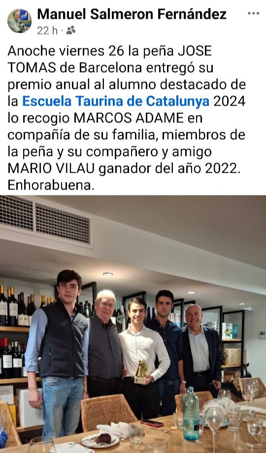 27-02-2025 • MARCOS ADAME, PREMIADO. El martes 18 de Febrero, la asamblea de la Peña Taurina José Tomás acordó premiar al novillero catalán MARCOS ADAME, como alumno destacado de la Escuela Taurina de Cataluña. El premio se entregará con ocasión de la cena estival de la entidad.