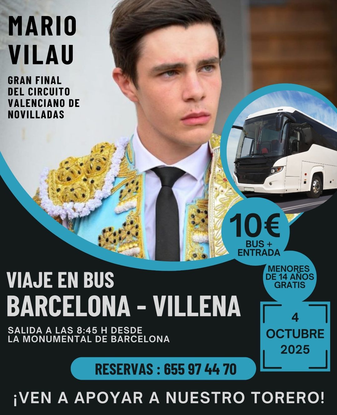 La afición catalana (la Peña Taurina el Prat, miembros de Tendido Cinco, socios de la UNIÓN TAURINA de CATALUÑA y aficionados varios) se desplazaron en autocar a Villena, para asistir a la FINAL DEL CIRCUITO VALENCIANO DE NOVILLADAS. Se vivió en la Plaza de Toros de Villena, una de esas tardes memorables.