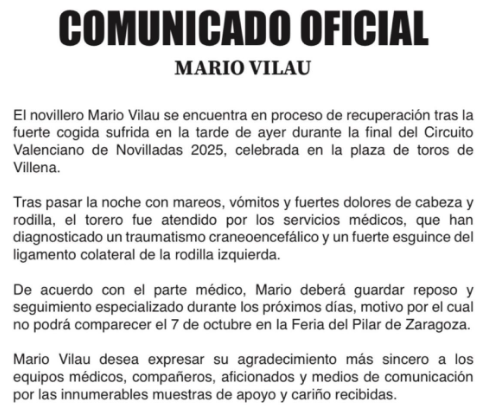 Comunicado Oficial, tras la cogida de Mario Vilau
