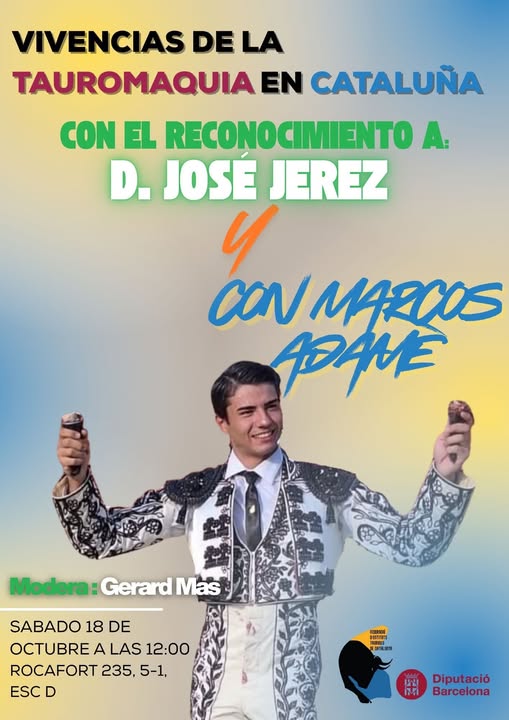 La FEDERACIÓN DE ENTIDADES TAURINAS DE CATALUÑA, tiene el honor de invitarle al acto "Vivencias de la Tauromaquia en Cataluña". Con el reconocimiento a D. JOSÉ JEREZ y la presencia del novillero MARCOS ADAME. Moderador Gerard Mas.